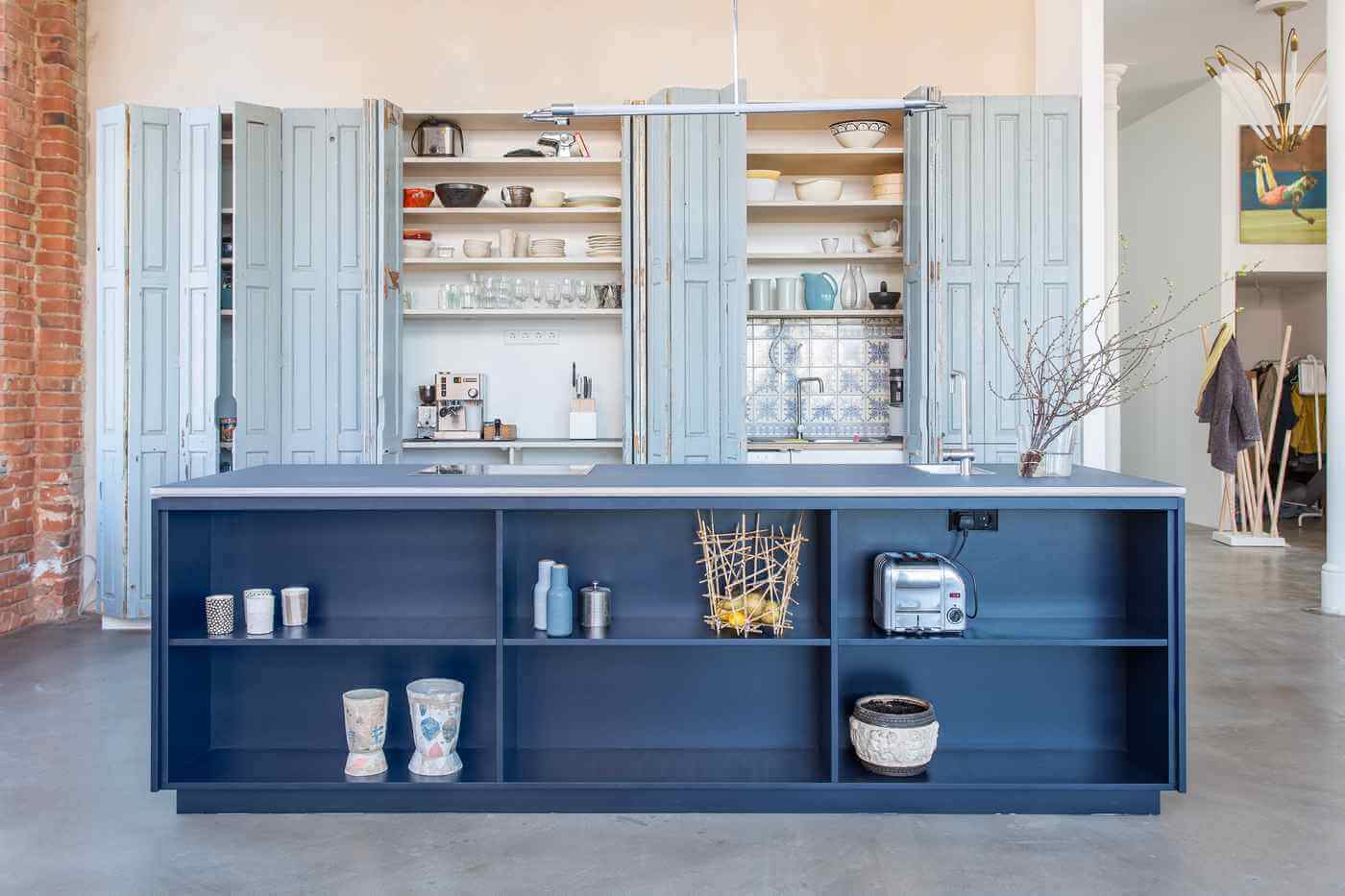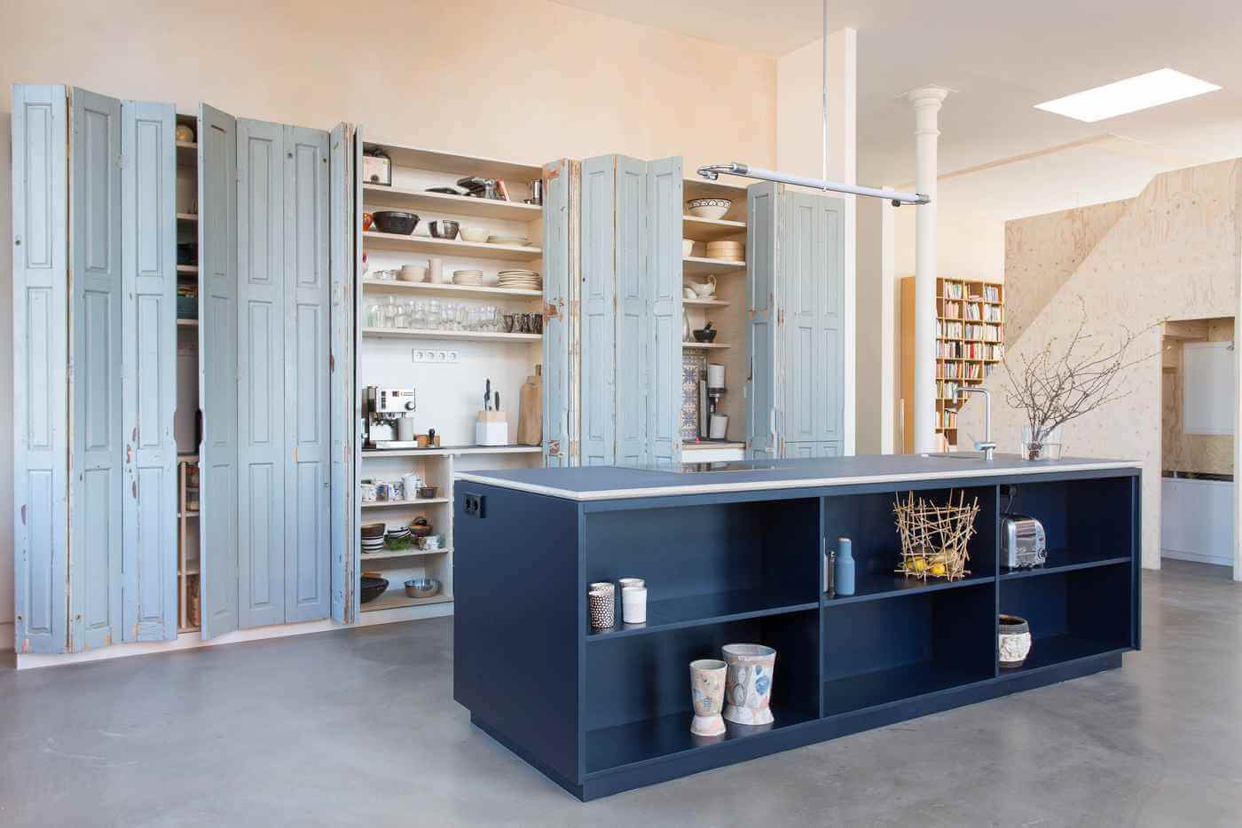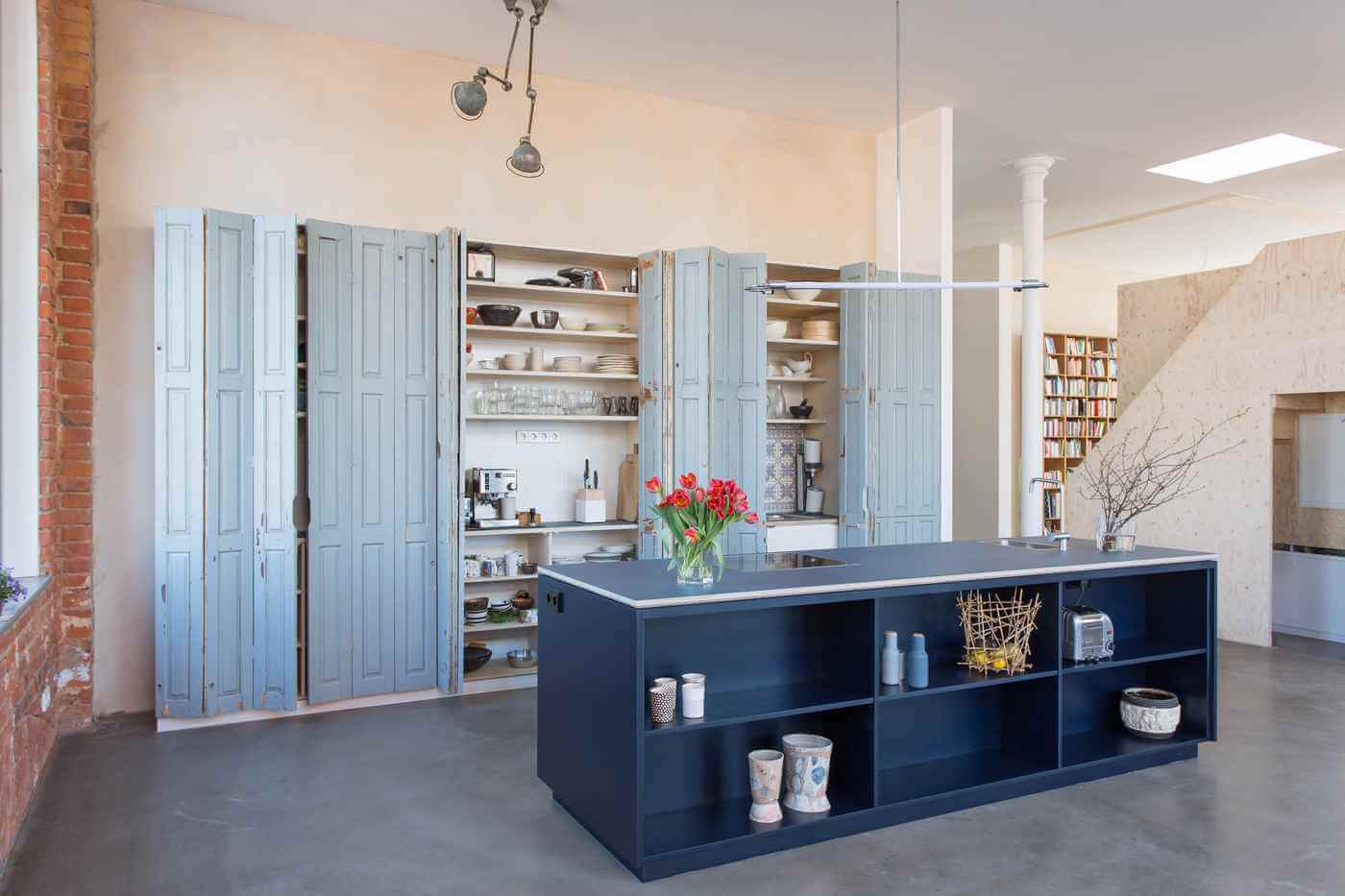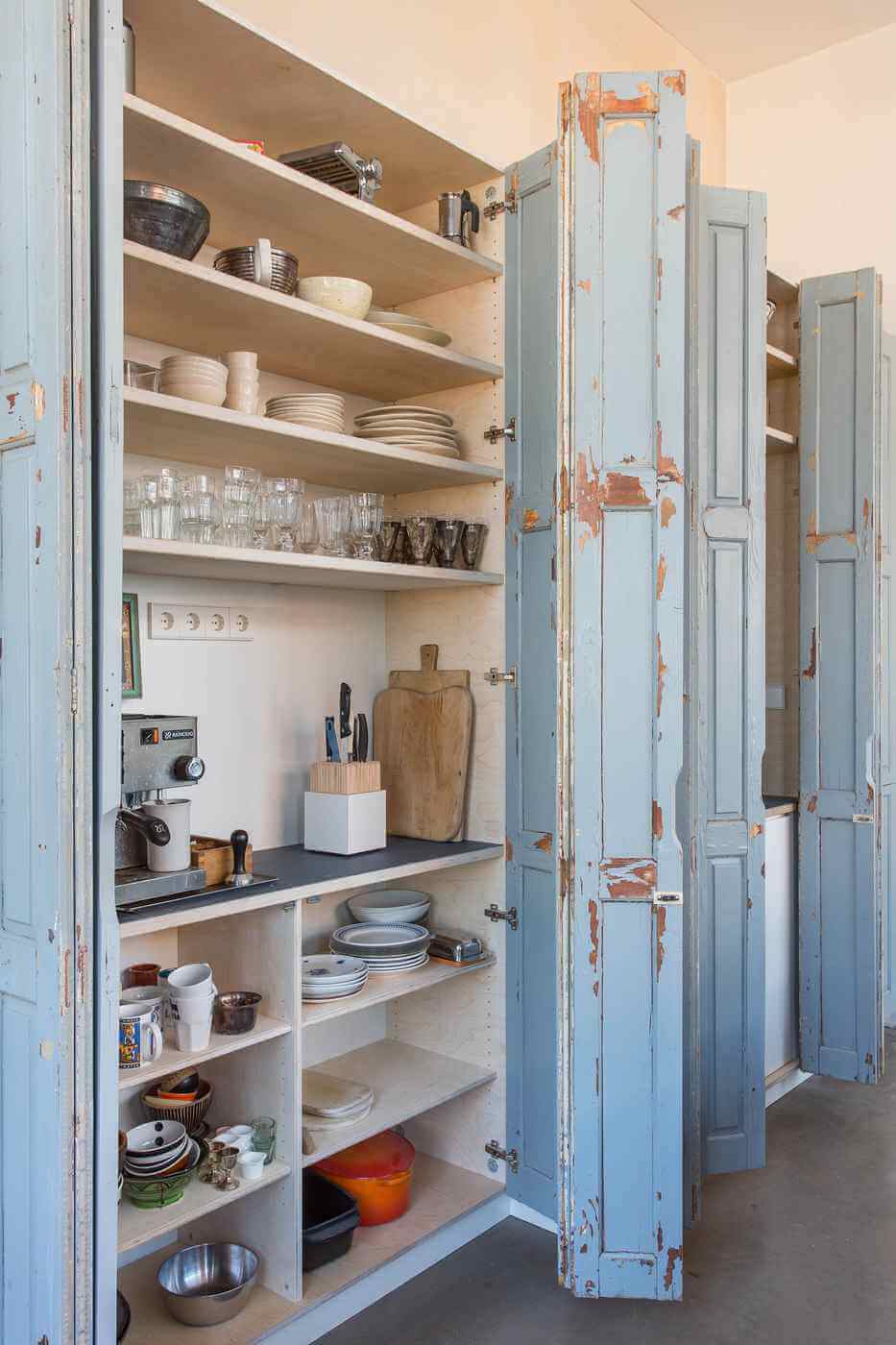 Geräumiger Küchenschrank mit alten Falttüren, die der Küche einen ganz besonderen Charme geben